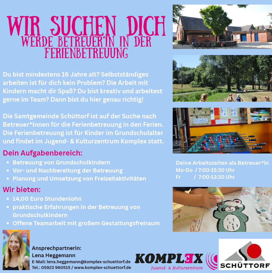 Die Samtgemeinde Schüttorf ist auf der Suche nach Betreuer*innen für die Ferienbetreuung in den Ferien 2023. Der Ferienhort ist eine Ferienbetreuung für Kinder im Grundschulalter. Dieser findet im Jugend- und Kulturzentrum Komplex statt.